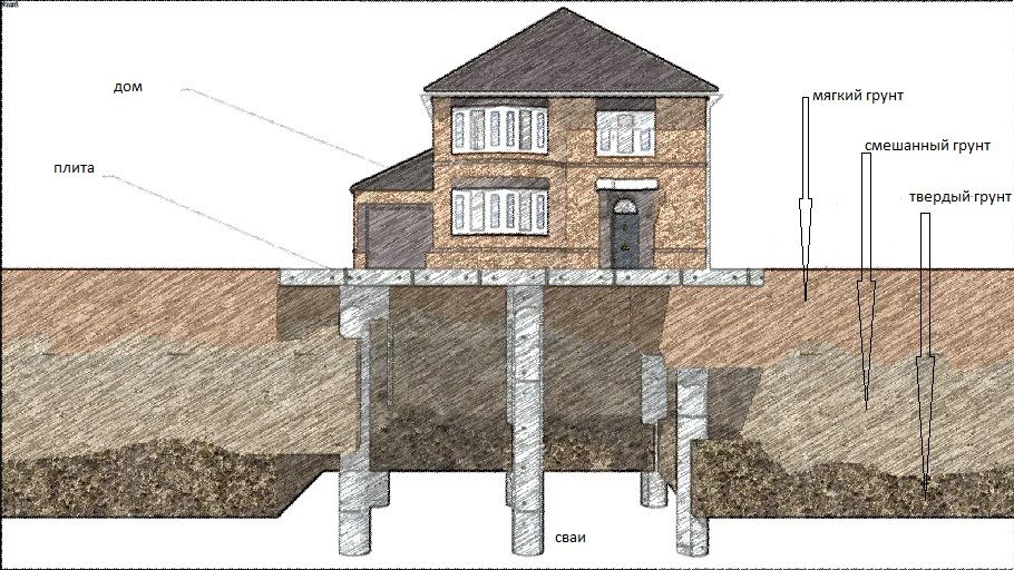 К сожалению, в малоэтажном строительстве, почти всегда получается использование висячих свай, слишком глубокое залегание прочных грунтов. Дополнительную прочность свайному фундаменту придает правильное расположение свай. Если забивать их на расстоянии до 8 длин ширины, то они оказывают дополнительное уплотнение грунта, для соседних свай и считаются связанными. Например для свай 30Х30 это расстояние до 2,4 метра. До 16 свай работающих вместе называется «свайный куст», большее количество «свайное поле». Перейдем к вопросу вычисления коэффициента сцепления сваи с грунтом. И именно для фрикционных свай, где работает сила трения сваи с грунтом. На первый взгляд, кажется что придание сваям дополнительных неровностей и шероховатостей, приведет к увеличению площади соприкосновения сваи с грунтом и как следствие увеличению её несущей способности. Но по факту, это не так. Во время забивки, близ лежащий грунт, действительно крепко сцепляется со сваей и создает около нее «свайную рубашку» и в дальнейшем, именно она взаимодействует с остальным грунтом. А ее коэффициент трения, будет такой же как и у остального грунта. Поэтому в расчете используется только коэффициент трения грунта. Чтобы правильно рассчитать свайное поле под будущую постройку, нужен высококлассный инженер. Ведь необходимо учитывать очень много данных. Помимо веса самой постройки нужно добавить по 300 кг. на кв.м для наполнения дома мебелью и пр. Учесть по 200 кг. на кв.м площади крыши для снега. А так же понимать максимально возможный уровень паводковых вод, даже если такого не было 20лет. И вот соединив вместе все данные о будущей постройке и грунтах, на которой она должна быть возведена, вам предложат варианты будущего фундамента. Сложно сказать какой он будет, сваи используют совместно с столбчатыми фундаментами, с ростверками (соединение надземной части свай между собой небольшими плитами или лентами), а может быть и совместно с большой плитой КСПФ (комбинированный свайно-плитный фундамент). Но главное одно, в современном строительстве, при создании фундамента очень выгодно и надежно использовать сваи.